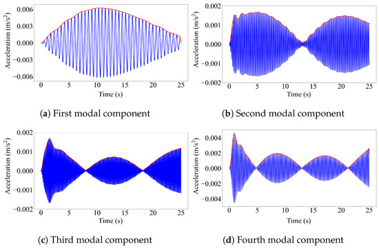 The first four modal components of the single-span bridge obtained from the CP response at m/s.