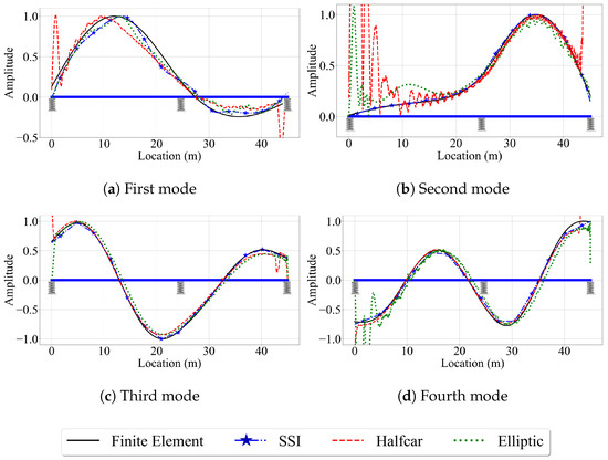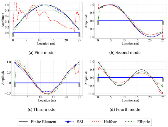 If we compare Figure 5 and Figure 6, we can also observe a major difference between the reference-based SSI method and the other two methods, which are based on modal component estimation. The reference-based SSI method provides modal coordinate estimates at discrete points, and the number of these discrete points is equal to the number of segments used. The mode shapes are then created by combining these discrete modal coordinate estimates, as explained above. On the other hand, the methods that are based on modal component estimation, i.e., the half-car method and the elliptic method, provide continuous mode shape estimates.
