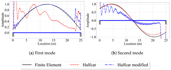 To confirm our explanation, we modified the vehicle frequencies such that the pitching frequency does not interfere with the first bridge frequency but interferes with the second frequency. To achieve this, we increased the stiffness of each axle tenfold, while keeping the other properties of the half-car constant. The resulting vehicle frequencies are Hz and Hz for bouncing and pitching, respectively. Then, we computed the FAS of the contact point response for this case and presented it in Figure 9. In this case, there is significant energy at the first bridge mode frequency but less energy at the second bridge mode frequency. As opposed to the first case, the pitching frequency ( Hz) is close to the second bridge mode frequency ( Hz). Thus, we can expect the pitching motion of the vehicle to interfere with the second mode vibrations of the bridge leading to poorer mode shape estimates. Indeed, when we plot the first and second mode shape estimates provided by the half-car method for the two different vehicle properties, Figure 10, we can observe that, for the modified vehicle properties, the estimated mode shape for the first mode is much improved compared to that obtained for the original vehicle properties. On the other hand, bringing the pitching frequency of the vehicle close to the second mode frequency led to a sharp decline in the accuracy of the second mode shape estimate. Hence, we can conclude that when a half-car model is used, the identification of the bridge mode shapes can be challenging in case the modal frequency is close to the pitching frequency of the vehicle.