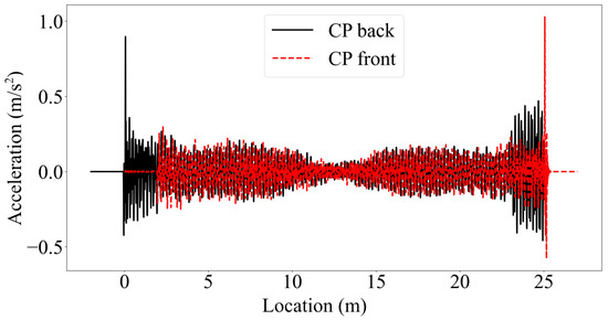 Further, Figure 7 shows that the mode shape estimates tend to deviate from the finite element solution at the supports, especially for the half-car method, and to some extent, for the elliptic filter method. Thus, we take a closer look at the behavior of the half-car model to try to understand why this model leads to poor mode shape estimates at the edges of the bridge. Figure 11 depicts the front and rear contact point accelerations along the length of the single-span bridge for m/s. When we investigate Figure 11, we can identify two peaks at the two edges of the bridge.
