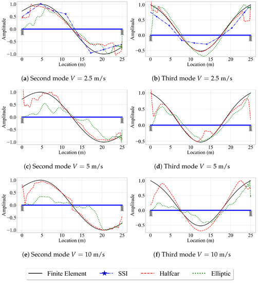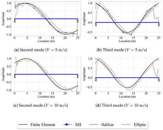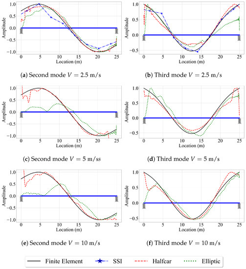 Figure 12 shows the second and third mode shape estimates from the VSMs, along with the exact mode shapes obtained from the finite element analysis for speeds of 5 m/s and 10 m/s. The first point that attracts our attention is the lack of mode shape estimates for the reference-based SSI method for m/s. Due to the relatively higher vehicle speed, the number of data points at each of the eight segments used for the reference-based SSI method reduces significantly for m/s compared to the lower speeds. Therefore, the subspace stochastic identification method fails to identify any stable modes for m/s and no mode shape estimates are provided by the reference-based SSI method at this speed (Figure 12c,d). Potential remedies to overcome this shortcoming can be using less number of segments at a cost of lowered spatial resolution for mode shapes or using a smaller time step. The latter, however, can be limited by the instrumentation used in real-life applications. On the other hand, for the cases where we can obtain stabilized mode shapes, e.g., for m/s, the reference-based SSI method provided excellent mode shape estimates along the entire length of the bridge; see Figure 12a,b.