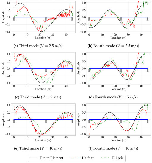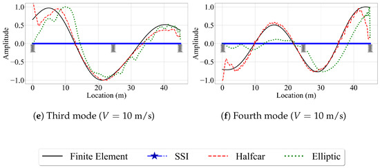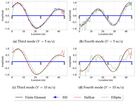Next, we evaluate the efficacy of the three VSMs in estimating the mode shapes of the two-span bridge under the consideration of road roughness, as simulated by the profile presented in Figure 4. The mode shape estimates provided by the half-car and elliptic methods for the third and fourth mode shapes of the two-span bridge are shown in Figure 17. No mode shape estimates were presented for the reference-based SSI method because this method failed to achieve any stable modes for the two-span bridge, even for the slowest vehicle speed of m/s when road roughness is considered. In general, the mode shape estimates for the two-span bridge provided by the half-car and elliptic methods were also less accurate compared to their counterparts for the single-span bridge when road roughness is considered in the analysis; see Figure 13 and Figure 17. This can be attributed to the additional complexity in the structural behavior provided by the middle support. Although Figure 17 only shows the third and fourth modes for brevity, the results are similar for the first two modes of the two-span bridge. Therefore, it can be stated that the estimation of mode shapes is more challenging for the two-span bridge using VSMs when road roughness is taken into account.