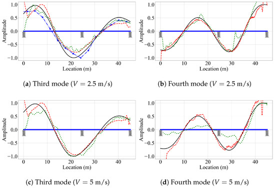 Next, we evaluate the effect of vehicle speed on the accuracy of the mode shape estimates. For brevity, we focus only on the third and fourth mode shapes, which have the highest modal displacements at the two ends of the bridge. Figure 16 depicts these mode shapes obtained from the three VSMs for vehicle speeds of 5 m/s and 10 m/s. The effect of vehicle speed for the two-span bridge is similar to its counterpart for the single-span bridge. The most striking effect of higher vehicle speeds is, once again, the lack of mode shape estimates from the reference-based SSI method. Since the segment length was kept constant between the single-, and two-span bridges, the number of data points per segment is constant for a given vehicle speed. As such, the reference-based SSI method failed to obtain stable mode shape estimates for m/s. However, whenever the reference-based SSI method was successful in obtaining stable modes, it provided mode shape estimates that are relatively accurate; see Figure 15.