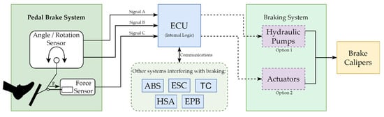On the left side of Figure 1 is the pedal system. It consists of two sensors that measure the force applied by the driver and the pedal position based on the rotation angle. The force sensor has a single output, while the angle sensor generates two independent signals. In the middle is one of the several electronic control units (ECUs) within the vehicle [48]. This system receives signals from the sensors. It operates on the braking system, either by generating hydraulic pressure or controlling a set of actuators that act on the brake calipers. It is important to note that in the current state of BBW technology, production is limited to electrohydraulic braking systems, commonly referred to as “wet” systems. Conversely, actuator-based technology, known as “dry” systems, poses certain challenges and remains an ongoing research subject, with only prototype implementations currently available. The ECU may also use the pedal input data and communicate with other braking-related subsystems to make the vehicle more controllable and maneuverable, improving kinematics and dynamics. Introducing this type of sensing technology can be an enabler for autonomous driving since there is no need for human intervention to actuate over a vehicular system explicitly; the ECU has this capability based on the information received from the multiple sensors [49].