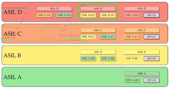 - Wang, Z.; Yu, L.; Pan, N.; Zhang, L.; Song, J. ISO 26262 Concept Phase Analysis on Distributed Electro-Hydraulic Braking System: The Influence of System Architecture on ASIL Decomposition. In Proceedings of the Volume 3: 16th International Conference on Advanced Vehicle Technologies; 11th International Conference on Design Education; 7th Frontiers in Biomedical Devices; American Society of Mechanical Engineers: Buffalo, NY, USA, 2014. [Google Scholar] [CrossRef]