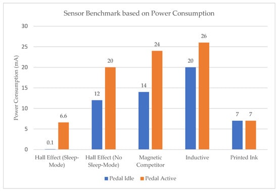 The following graph, Figure 3, shows a comparison of the power consumption of the sensors. On one side is the Hall-effect sensor with sleep function enabled and disabled, including a magnetic sensor from another competitor. On the other side is the inductive angle sensor. Finally, the power consumption of the printed ink-based sensor, a prototype developed in this project (which will be addressed later), is also shown in the graph. All the tests were performed to measure the power consumption in both scenarios: when the pedal is idle and when it is active.