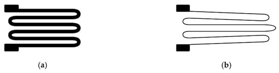 Diagram showing the physical behavior of a strain gauge. When a force is applied, it stretches, increasing its electrical resistance. (a) Strain gauge at rest position, broader tracks and better conductivity; (b) strain gauge in a stressed position, narrower tracks increase electrical resistance and decrease conductivity.