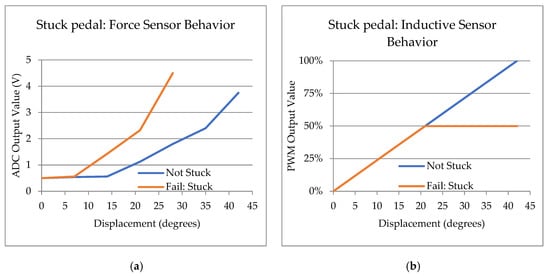 Based on the previous analysis, the mechatronic pedal must have sensors that measure the physical magnitude associated with the pedal position. There are multiple ways to detect force exerted by the driver on the pedal. Sensors commonly used in the EMB actuator include the following types: pressure, torque, angular displacement, and axial displacement sensors [45,46]. In automotive applications, choosing the right sensor involves considering factors such as resistance to moisture, dust, oil, and thermal drift. Desired features include excellent linearity, wide operating range, cost-effectiveness, high resolution, contactless rotation, low power consumption, ease of manufacturing, and simple signal conditioning. Capacitive rotary and optical sensors, although highly sensitive, have been excluded due to their dependency on dry and clean environmental conditions [47]. The proposal for this project is to use a combination of two different sensors: an angle sensor and a force sensor. The figure below is an illustration of how this system would work.