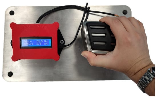 A commercial force sensor was chosen for this prototype, although research was also conducted on strain gauges, which will be discussed subsequently. Opting for the force sensor provided multiple advantages, including a reduction in development time. Firstly, the sensor already integrated a Wheatstone bridge [57,58], making it a compact solution. Additionally, the sensor offered a comprehensible analog output, which is advantageous as it aligns with the widespread practice of integrating analog-to-digital converters (ADCs) into the vehicle’s ECUs. Furthermore, having two different signals in the pedal system is beneficial for functional safety, providing redundancy through different protocols [59]. Lastly, the force sensor exhibited a faster response time than the existing position sensor. However, the main drawback of force sensors is their higher price, which is a handicap and poses a challenge in cost-sensitive automotive applications.