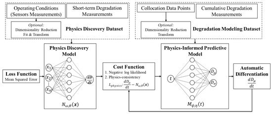 Equation (2) shows the cost function of the predictive NN, which has two terms: (1) for fitting the data and (2) for following the underlying physics learned by the physics discovery NN. The model is trained using the labeled data and represents the error between the estimates (i.e., the network’s output) and the observed (true) values. is a constraint in the optimization process of the network cost function and the scalar parameter weights the constraint. The proposed approach aims to achieve consistency of the predictions with the underlying physics, which is discovered by the first NN, by minimizing . The output of the predictive NN is a parametric distribution, which is why the negative log-likelihood of the actual values of degradation intensity is used as the loss term for fitting the data. In Equation (2), is time, represents the vector of weights, and is the vector of bias parameters of the network. The automatic differentiation technique [31] is used to calculate term in .