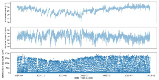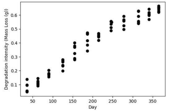The first dataset contains operating conditions and degradation measurements for 72 coupons with no initial damage which were in the field between 24 to 36 days. The operating conditions, including temperature, humidity, and solar radiation, were collected every 30 min, as shown in Figure 2, and the mass losses were recorded before removing the coupons (i.e., 72 data points). Figure 3 shows the distribution of the calculated degradation rates using this dataset. The second dataset is similar to the first dataset, except that the coupons were kept in the field for one year and the mass loss measurements were collected cumulatively at the end of each month, as shown in Figure 4.