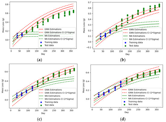 Comparing the predictions of the two NNs for the test data (i.e., the green data points in Figure 5) reveals that guiding the NN significantly improves its performance. In the case with limited training data (Figure 5a,b), the regular NN overfits the training data points and fails to learn the underlying pattern. However, the GNN provides relatively acceptable estimates for long-term degradations.