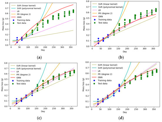 To further evaluate the proposed method’s performance, its prediction accuracy is compared to other machine learning techniques, including support vector regression (SVR), linear regression (LR), and polynomial regression (PR) (see Table 1). Non-linear models of PR and SVR with polynomial kernel function show the worst performances, as shown in Figure 6. Although they represent a good fit for the training data, their estimates for the test data points are considerably inaccurate.