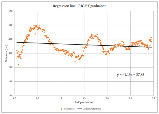 As said, to determine the leveling staff imperfections, such as zero error and change in scale, staffs must be calibrated. Calibration of a leveling staff or any analog linear measuring instrument (measuring tape or similar) is a procedure that has the goal to determine its true scale value and possible zero error. In that procedure, nominal values indicated on a scale and their measured values are compared. From that set of differences which are scattered discrete data points, it is needed to obtain a mathematical model. That model must be representative of the given data and simple and precise for later application in post-processing of the field leveling data. Praxis has shown that regression straight line is the best suited mathematical model for this purpose. In Figure 1, an example of calibration data for the right graduation of 3 m leveling staff is presented. Deviations of graduation lines are represented with orange points. The regression line and its equation in explicit form, y = ax + b, are shown. The slope coefficient a defines the direction of the regression line, which represents the m0—the coefficient of deviation between actual and nominal scale and is given in parts per million (ppm). Value b is y coordinate of the intersection of the regression line with the axis Y which represents the zero error of the leveling staff and is given in micrometers (10−6 m). In addition to these parameters, it is always necessary to have the mean air temperature during the calibration of the leveling staff, and later during field measurements air temperature paired with each staff reading. In that way, it is possible to compute the corrected reading value of the leveling staff (Equation (1)). The corrected value of leveling staff reading is computed according to the expression [20]: