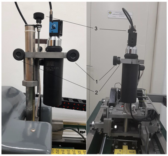 Digital camera with telecentric lens mounted on a positioning drive: lens and camera carrier screw (1), positioning screw for lens and camera carrier (2), and the screw for fine movement of the lens and camera carrier in the vertical direction (3).