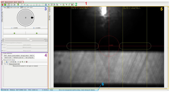 View of the software main graphical user interface that consists of: (1) Menu bar, (2) Toolbar, (3) Positioning drive management window, (4) Calibration measurement and graphics management window, (5) Graphics and data window, and (6) Status bar.
