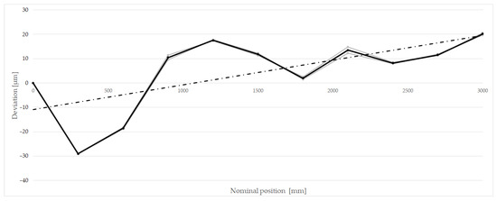 A calibration of the comparator, or more precisely, the comparator’s encoder, was conducted by the Precision Length Measurement Laboratory of the FMENA of the University of Zagreb, being also the National Laboratory for Length in the Republic of Croatia. The calibration measurement procedure was conducted by performing two repetitions of the positioning uncertainty measurement by using the Renishaw ML10 laser interferometer. The measurements were conducted in the positive direction of the comparator’s X-axis. Table 3 presents the calibration results, while Figure 7 shows a graph depicting the deviations of the comparator’s linear encoder compared to measurements obtained with a laser interferometer. The following findings were established: