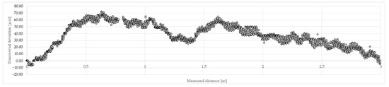 The transversal deviations were measured by stretching a thin dark thread with a thickness of 0.16 mm across the entire calibration range of the comparator. A clean white tape was placed below the thread to enhance contrast. The start and end points of the thread were positioned in the center of the camera’s field of view, and images were captured with a positioning drive step of 1 mm from the beginning to the end (0–2999 mm) of the comparator. The analysis of the measurement results was performed using a program developed in the Matlab software package. Deviations of the center of the camera’s field of view relative to the thread passing through the center of the field of view at the beginning and end of the comparator system were determined. The obtained data were then transformed into a coordinate system in which the abscissa passes through the center of the field of view at the beginning (0 mm) and end (2999 mm) of the comparator system, representing the longitudinal axis of the comparator (Figure 8). Numerical analysis revealed a maximum transversal deviation of 72 µm in absolute value, which is consistent with the a priori estimation. By applying the Pythagorean theorem, a maximum longitudinal deviation due to transversal deviation was determined to be 0.004 µm in absolute value, which represents a negligible influence on the final measurement uncertainty and does not need to be considered in the computation of the measurement uncertainty budget.