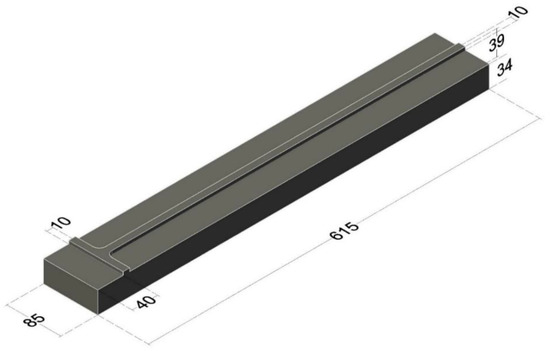 When the precise leveling staff is mounted for calibration in the comparator, the base plate is pressed against a half sphere. The bottom edge of the baseplate cannot be captured by the camera, meaning the software cannot detect it because it is rounded and out of focus. To reliably determine the zero error of the leveling staff, a special method for determining the zero position of the comparator had to be developed. The zero position of the comparator is the position when the encoder is homed and the origin coincides with the machine zero, while the center of the camera’s field of view is at the 0.000 mm position. At that point, the central transversal index (equivalent to the horizontal thread of the level’s crosshair) must coincide with the bottom of the reference surface, i.e., the lower edge of the baseplate. As a result, a special steel standard (Figure 9) was created, featuring finely and sharply sanded transversal and longitudinal square ridges. The upper surface of the ridges is at the same height as the invar tape during calibration to avoid camera elevation or lowering due to focusing. The lower surface of the standard is painted in a black matte color to achieve high contrast and enable the detection of the edge of the ridge as the graduation line edge.