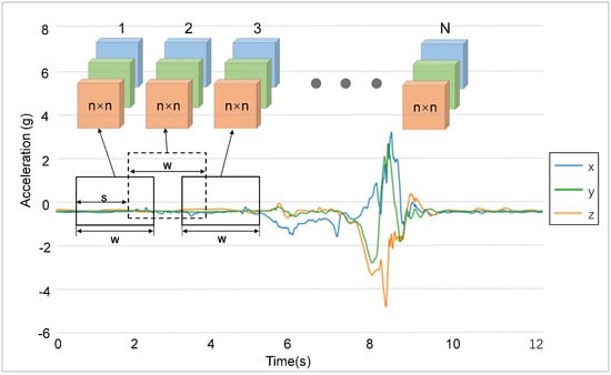 In the SisFall and UnMib SHAR datasets, the data sample size was not uniform, and regular activities, such as slow walking and jogging, were present in both datasets. These activities were sampled for longer periods of time compared to the other behavior. To obtain falls and ADLs datasets with uniform data specifications and to ensure data integrity, we process the data accordingly for both datasets. In SisFall, the entire ADLs are sampled with a 12 s duration. We split the longer time series activities into a few equal length subsegments, each of 12 s duration, whereas, in the fall samples, the sample sizes are all 15 s. The fall dataset is downsampled to reshape the sample size to 12 s. The sampling frequency of UnMib SHAR is different from SisFall. The segmented fragment size of the long time series samples is 3 s. The segmented ADLs subsequences, downsampled fall samples, and unprocessed raw data are recoded to obtain a falls and ADLs dataset with uniform data size. The SisFall dataset includes 3778 ADLs and 1798 falls samples, each with a sample size of 12 s. UnMib SHAR includes 4191 falls and 7578 data samples of 3 s duration. We use overlapping sliding time windows to segment the data, with each time window being W samples long, and reshape the samples into rectangular data blocks. The whole sequence is partitioned into a sequence of data blocks of length N by gradually moving backwards with a fixed sliding step S. If the sliding step is too large, the segmentation will result in the loss in correlation between time series, so the moving step of the sliding window needs to be smaller than the width of the time window. If the sliding step is too small, it will cause problems, such as serious data overlap and inconspicuous distinction of local information. Figure 2 illustrates the process of sliding window segmentation of subsequence of our multi-channel data from acceleration sensors.