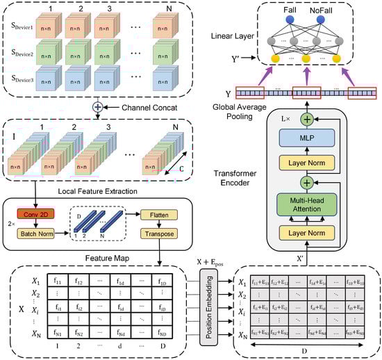 The encoding layer consists of L sub-encoding layer. Each of them is followed by a residual connection structure [32], which avoids the problem of gradient information loss and accuracy degradation as the depth of the network increases during the cyclic computation of the sub-encoding layers. The sample data representation in sub-encoding layer, as the input to a multi-layer perceptron (MLP), Y uses the output of the entire Transformer encoding layer. Our encoding layer outputs global average pooling (GAP). The final fall and no-fall classification results are provided by a single linear layer.