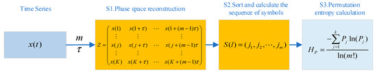 Let be a time series of length N: , is the embedding dimension, is the time delay, and is the number of reconstructed components. The calculation steps for PE are as follows [19,24,44,45]: