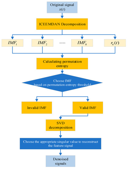 Process of signal denoising method based on ICEEMDAN–PE–SVD.