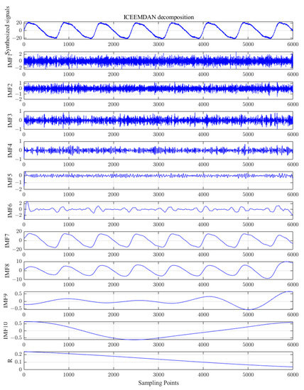 Combined with the findings from [23], after several experiments; setting the parameters as , , , and ; and then performing ICEEMDAN decomposition on the synthesized simulated signal, 10 IMF components and 1 trend component R were obtained, as shown in Figure 6. The PE of these components was calculated and the results are shown in Table 1.