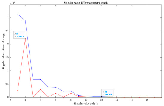 Then, the reconstructed signal was processed with SVD decomposition, and the decomposed singular value difference spectrum was obtained, as shown in Figure 9 below.
