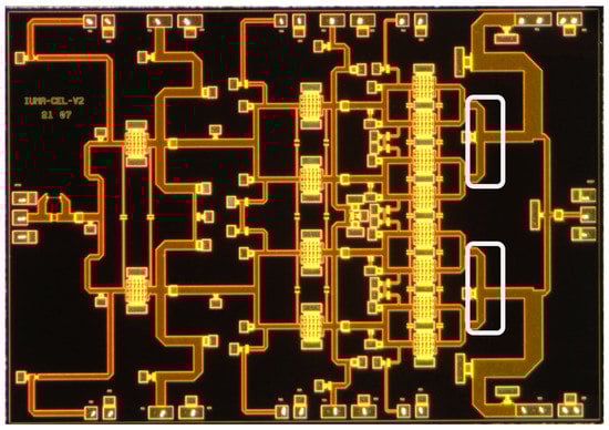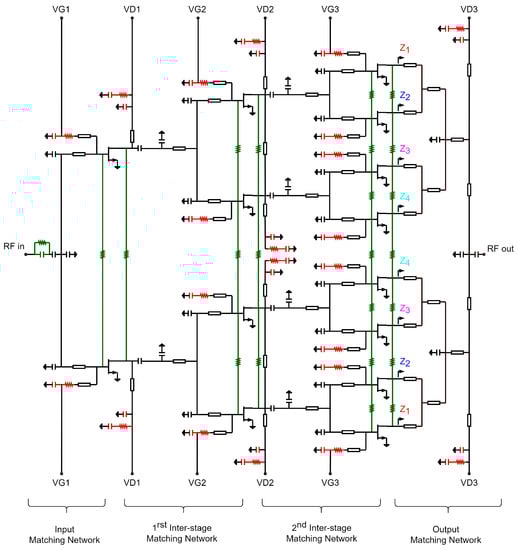 Figure 2, the output matching network is an interface between the eight transistors of the third stage (power stage) and the ground–signal–ground (GSG) output port. Its main purpose is to provide the optimum load to the transistors while minimizing the losses. The design of this network is the most critical part when designing an HPA, since the output power level directly depends on it. The output matching network was designed to be symmetrical to the output of the circuit and originally consisted of a double-L matching network made up of two T-lines and two capacitors. Thanks to the symmetry of the network, only three capacitors were needed for the entire matching network, instead of the sixteen originally needed (two for each transistor).