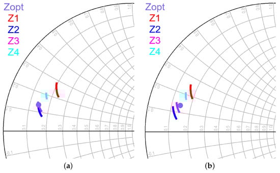 Figure 4 displays the optimum impedance for maximum power delivery (Zopt) and the actual impedances that the top four transistors see in the 17.3 GHz to 18.4 GHz frequency range after analyzing the EM simulations of the output matching network (
