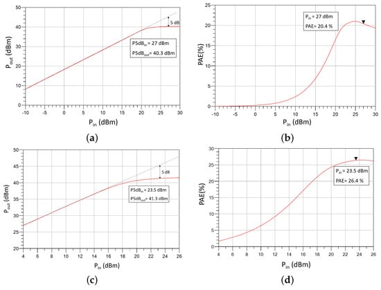 Figure 5c,d) are displayed. The simulations demonstrate that the inclusion of asymmetry results in a 1 dBm improvement in Pout and a 6% improvement in PAE.