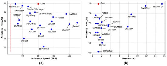 Performance comparison on the Cityscapes test set. (a) Speed–accuracy, (b) model size–accuracy. Red dot indicates our method, while blue dots mean other methods. The red line represents the real-time speed. “*” indicates that the corresponding method is pre-trained on other datasets. Our method achieves the most advanced trade-off between inference speed, segmentation accuracy, and model size.