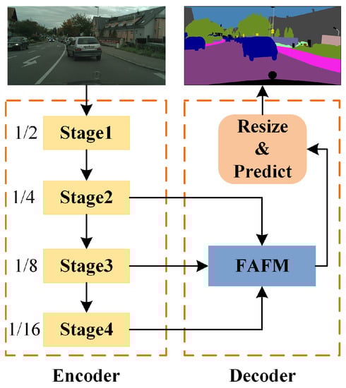 The overall network architecture of MFAFNet is shown in Figure 2, which is an asymmetric encoder–decoder structure. The encoder contains four down-sampling operations, decreasing the resolution to 1/16 to reduce the computational overhead of the feature extraction process. The decoder contains a feature adaptive fusion module (FAFM), which fuses the output features of multi-levels in the encoding stage to reduce the loss of spatial detail information and improve the segmentation accuracy.