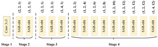 The design details of the encoder are shown in Figure 3, which consists of four stages. Stage 1 uses a standard convolution with stride of 2 to achieve the first down-sampling, which quickly reduces the resolution of the input features and reduces the computational complexity. The 2nd, 3rd and 4th stages are composed of SAR-nbt modules, containing 2, 3, 9 SAR-nbt modules, respectively, and down-sampling only happens in the first SAR-nbt module of each stage. To avoid weakening the feature-extraction capability of the network due to the use of depth-wise convolution, the channel expansion is added to the SAR-nbt module, and the expansion factor is 4 only for the last one in stage 3 and stage 4, and 2 for the others so as to avoid a too-wide channel dimension that would substantially increase the computational cost. In addition, in order to expand the receptive field to extract context information at a distance and to avoid losing semantic information by introducing dilated convolution prematurely, dilated convolution is introduced in the middle layer of the network. The SAR-nbt module in stage 4 introduces dilated convolution to gradually expand the receptive field, and the dilation rates are set to 2, 4, 6, 8, 10, 12, 12, 12, and 12, respectively.