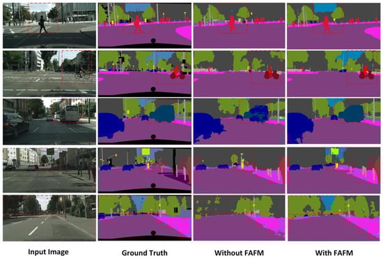 Figure 6 displays the visualization results of the FAFM module on the Cityscapes validation set, with the red dashed boxes marking the parts of the same image where the segmentation accuracy contrast is more obvious. As can be seen, for the results without the FAFM module, such as the sky in the first image, the car in the third image, and the traffic sign in the fourth image, after a series of encoding and decoding operations, the result prediction directly by the high-level feature maps lost the original spatial detail information of the object. The method that uses the FAFM module may also suffer from the problem of inconspicuous object edge segmentation, but it can basically retain the original spatial information of the objects and achieve better segmentation results. In summary, the proposed FAFM module can efficiently fuse the multi-level output feature maps in the encoder to reduce false predictions and substantially improve the accuracy of the object segmentation with less computational overhead.