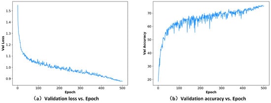 The validation loss curve and accuracy curve of MFAFNet during 500 training epochs on Cityscapes validation set.