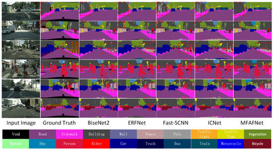 In Table 6, we further evaluated the IoU (%) performance for each category on the Cityscapes test set. Our method achieved better segmentation results on most of the categories, with the highest IoU scores in 16 out of 19 categories, such as roads, buildings, cars, skies, and traffic lights. Our method has better recognition ability for objects of different sizes with an average accuracy of 75.9% for the categories, which fully illustrates the efficiency of the MFAFNet.