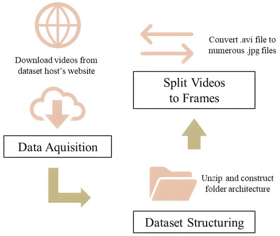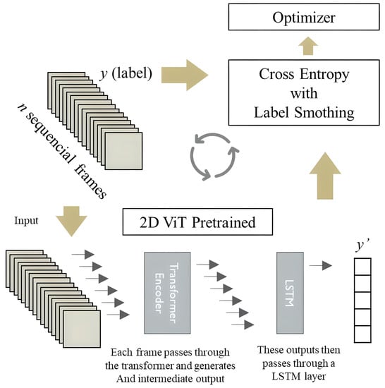 To enhance the temporal modeling capabilities of the pre-trained 2D ViT, a fine-tuning approach was employed by replacing the classifier method with an LSTM layer. This LSTM layer effectively captures the memory of all inputs from the video segment previously processed by the 2D ViT, generating a corresponding output. A cross-entropy loss function with label smoothing was applied to optimize the classifier parameters during the training process. For further information and a detailed methodology breakdown, please refer to Figure 7. The procedure of the dataset preparation phase for the pre-trained 2D ViT is equivalent to the procedure for 3D ResNet, which is presented Figure 4.