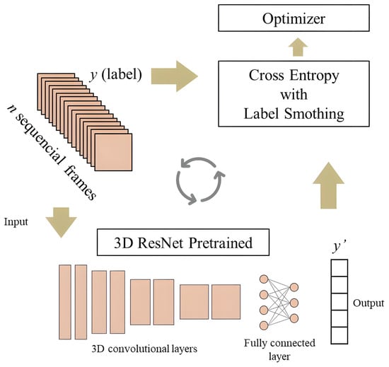 Often these architectures become the basis of future models, with pre-trained parameters allowing fine adjustments and small architectural changes to achieve other goals. Figure 4 shows the main step using the 3D ResNet architecture, and Figure 5 presents its training process. Hara et al. [39] trained 3D ResNet models with the Kinetics dataset [70] and the moments in time dataset [71]. This pre-trained model was fine-tuned with HMDB51, and, additionally, the loss function used was cross-entropy with label smoothing.