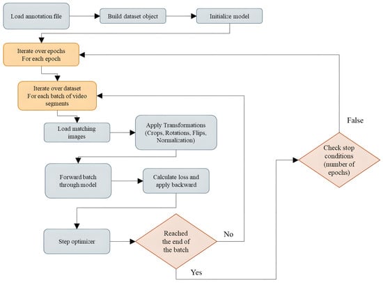 During the training process, the first step involves loading the annotation file, which contains information about image files and their corresponding labels for each video, thereby constructing the dataset object. Following this, the target model is initialized, and its parameters are either randomly initialized or loaded from a pre-trained model. During each epoch, video segments consisting of “n” sequential frames are transformed, passed through the model, and an output is generated.