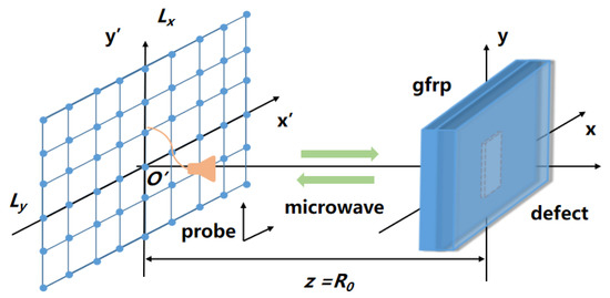 As illustrated in Figure 1, there is continuous movement of the control probe along the and directions, transmitting and receiving microwave signals within the scanning range . The GFRP specimen contains delamination defects and is located at a distance from the scanning plane where the control probe is positioned. During the 2D scanning process, the scattering at each sampling position is recorded as a matrix, with each element of the matrix representing the complex echo signal of a specific sampling coordinate point.