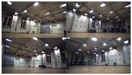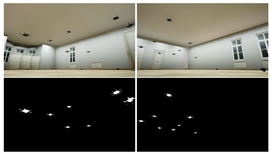 We replicated the coarse appearance of the HML laboratory in the virtual reality in which our simulations were located. The setting with eight cameras performing 2D projections was applied. This means that for every animation, eight video sequences were obtained. Due to the animation created, the 3D positions of the drones were known. This makes it possible to extract 2D masks and bounding boxes processed by the neural network. An sample simulation frame with the corresponding drone masks, viewed from the perspective of two selected cameras, is depicted in Figure 6.