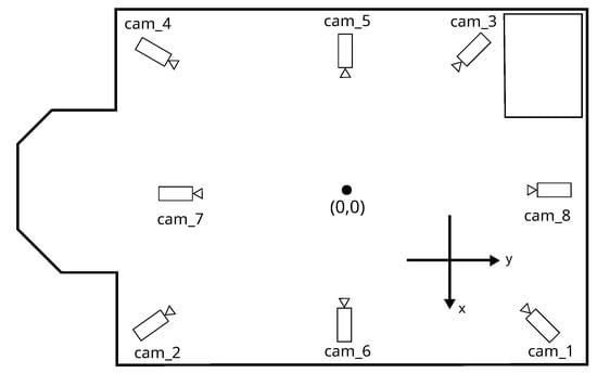 The summary of captured sequences containing numbers of cameras and tracked drones as well as video resolution, duration, and frames per second are presented in Table 1. The spatial arrangement of cameras is depicted in Figure 2. The synthetic datasets contain videos from eight cameras, while the real ones contain data from only four corner cameras.