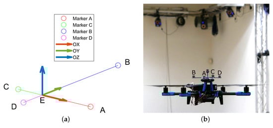 A motion capture system computes their 3D coordinates in subsequent time instants, which allows for the determination of the 3D drone position and orientation in the following way: In the first stage, the center of the cross is established, and markers are identified. This is realized by comparing distances between the markers. Due to the limited precision of the measurements, we cannot assume that the arms of the cross are coplanar. Thus, we compute the position of the center marker as the projection of point B from Figure 3a on the line segment. Then, versors of the local drone coordinate system are determined using the following formulas: