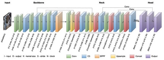 The YOLOv5 version that uses PyTorch instead of the Darknet framework was selected. The network structure contains three main components: a backbone, a neck, and a head, as shown in Figure 8. In the backbone, the new CSP-Darknet53 architecture was applied. It uses the C3 layer, which is a simplified version of the used CSP Bottleneck layer, by removing one of the four main convolutions from inside of CSP Bottleneck layer. To reduce the number of parameters, truncation of the gradient flow is performed. The CSP networks preserve DenseNet’s feature reuse qualities and reduce the redundant gradient information that normally occurs, which helps to increase the inference speed [29]. In the neck block, a modified version of the PANet (Path Aggregation Network) with C3 layers and the SPPF (Spatial Pyramid Pooling Fast) have been used [30]. The SPPF is an improved, faster version of the popular SPP with an increased flow of information, making it easier to locate pixels correctly. The head block is the same as the one used in YOLOv3 and YOLOv4, which contains three convolution layers that are used to predict the location of bounding boxes and calculate the scores. In our case, the head block was modified by performing the transfer learning, which starts the training with pre-trained weights achieved for the COCO dataset. The transfer learning may result in a less precise network, which is originally adapted to a different detection problem. However, in most cases, it allows us to obtain satisfactory results with fewer training samples and with a lower computational cost and minimize the probability of network overfitting.