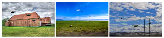 Ten simulations with a different number of flying drones (2–8) and 20 s of duration were prepared. A DJI Mavic model 2 (Figure 7a) and a custom-designed one (Figure 7b) were used in the animations. Eight virtual camera streams were created with 25 fps each, providing a total of about 40,000 synthetic images for training and testing.