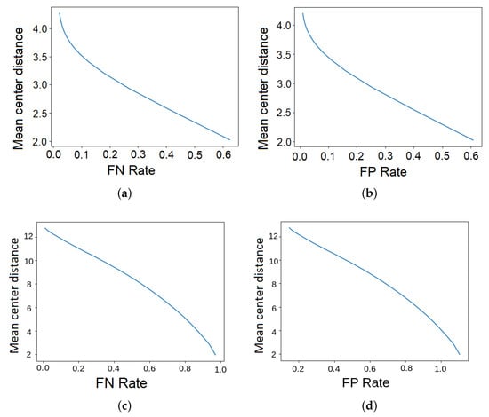 Mean Centers’ Distance in relation to false positive and negative rates for the AirSim and HML data. The resolution of the processed images by the YOLO network is . (a) AirSim, MCD/FNR. (b) AirSim, MCD/FPR. (c) HML, MCD/FNR. (d) HML, MCD/FPR.
