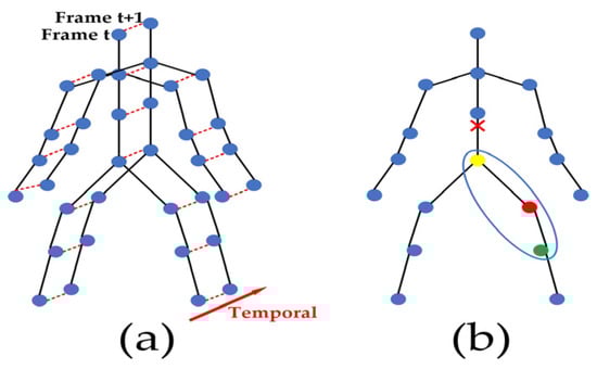 Yan et al. [12] proposed a human spatial–temporal skeleton graph used to simulate structured information between joints in spatial and temporal dimensions which referred to the joints in the same frame and the same joints in all frames, respectively. Figure 1a is an example of a constructed spatial–temporal skeleton graph where joints are represented by vertices and their natural connections in the human body are represented by spatial edges, i.e., the black lines in Figure 1a. Each temporal edge is the connection of corresponding joints in two consecutive frames, i.e., each red dotted line in Figure 1a. The ST-GCN was composed of 9 basic blocks, each of which performed spatial and temporal dimensional convolution. The spatial dimension convolution operation of each frame in the skeleton sequence data could be expressed as: