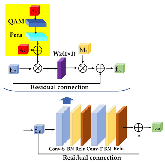 Specifically, the construction of the quasi-adjacency matrix and the implementation of the adjacency matrix enhancement strategy are as follows: Firstly, the adjacency matrix is obtained according to the predefined human skeleton graph, where Ak represents the adjacency matrix without self-joining and I represents the identity matrix, k = 1, 2, 3, and the quasi-adjacency matrix QAM() with the same dimension as is also created at the same time. Then, the parameterized quasi-adjacency matrix Ek is added to the adjacency matrix . The above steps can be expressed by the following formulas: